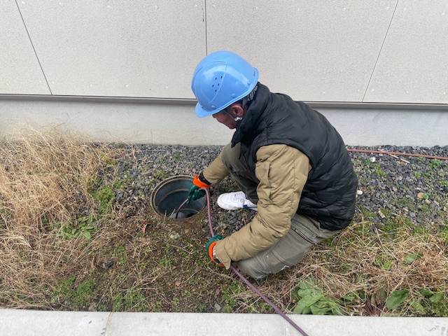 流れが悪くなった排水管の詰まりを取り除き、高圧洗浄機できれいに洗い流します。